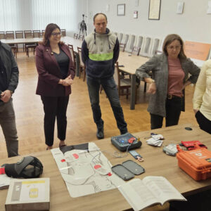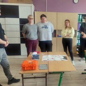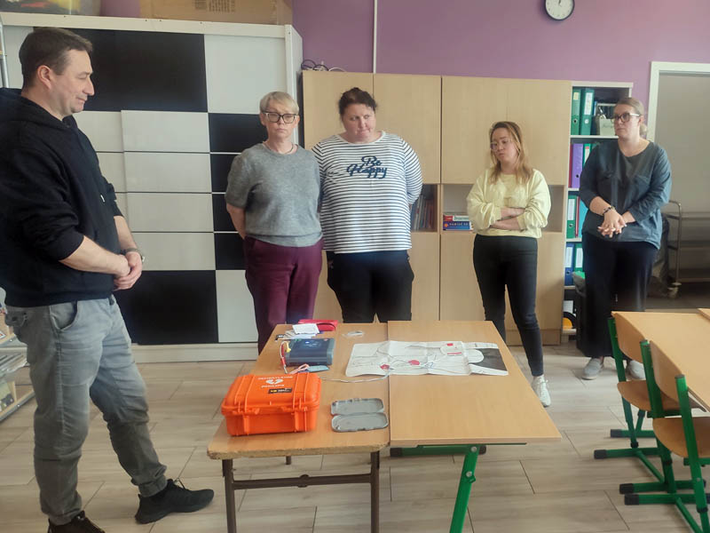 Montażowi defibrylatorów towarzyszyły szkolenia dla pracowników urzędu i szkół przeprowadzone przez ratowników OSP Piątek – Łukasza Gamrowskiego i Pawła Pożuczka.